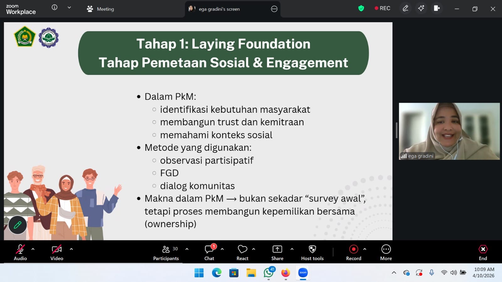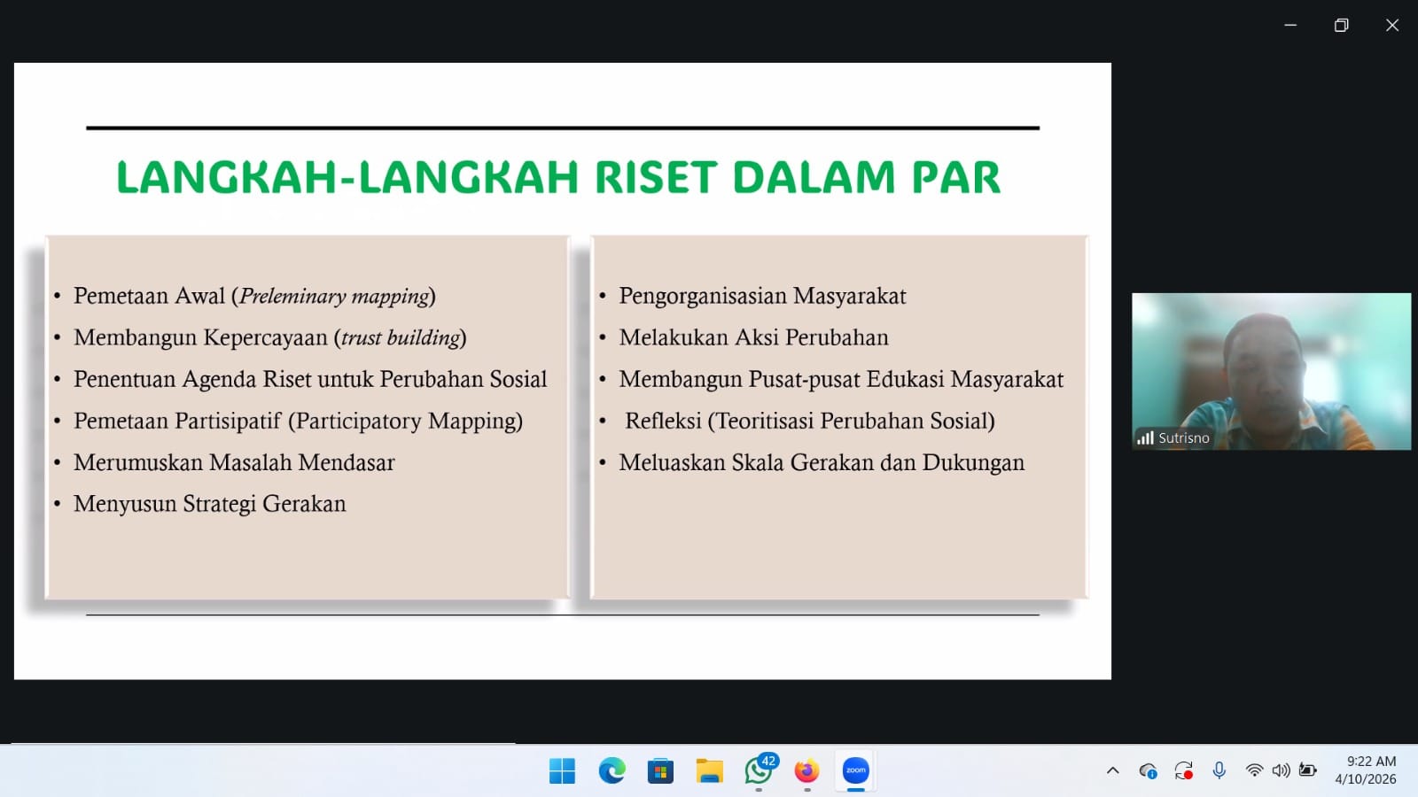Kegiatan ini bertujuan untuk memperkuat pemahaman akademisi dan praktisi mengenai pentingnya pendekatan partisipatif dalam pelaksanaan pengabdian kepada masyarakat. Dalam pemaparannya, dijelaskan bahwa pendekatan Participatory Action Research (PAR) dan Community-Based Research (CBR) bukan sekadar metode, melainkan paradigma transformatif yang menempatkan masyarakat sebagai subjek utama dalam proses pembangunan.